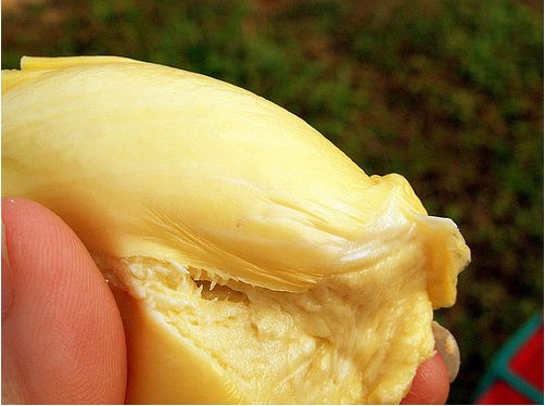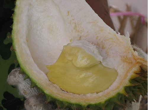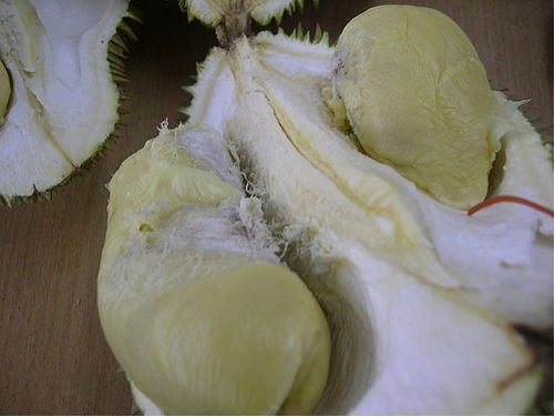 un extraño hedor inunda la habitación en la que nos encontramos (nota: Una durian y un espacio cerrado son mala combinacion) . El aspecto no invita mucho mas que su olor, la degustacion no se me hace recomendable, aunque he de hacerlo. El aspecto …. como unos diez o doce «riñones» cubiertos por una pulpa desagradable. Precisamente lo que se come es la pulpa, los «riñones» son la simiente.