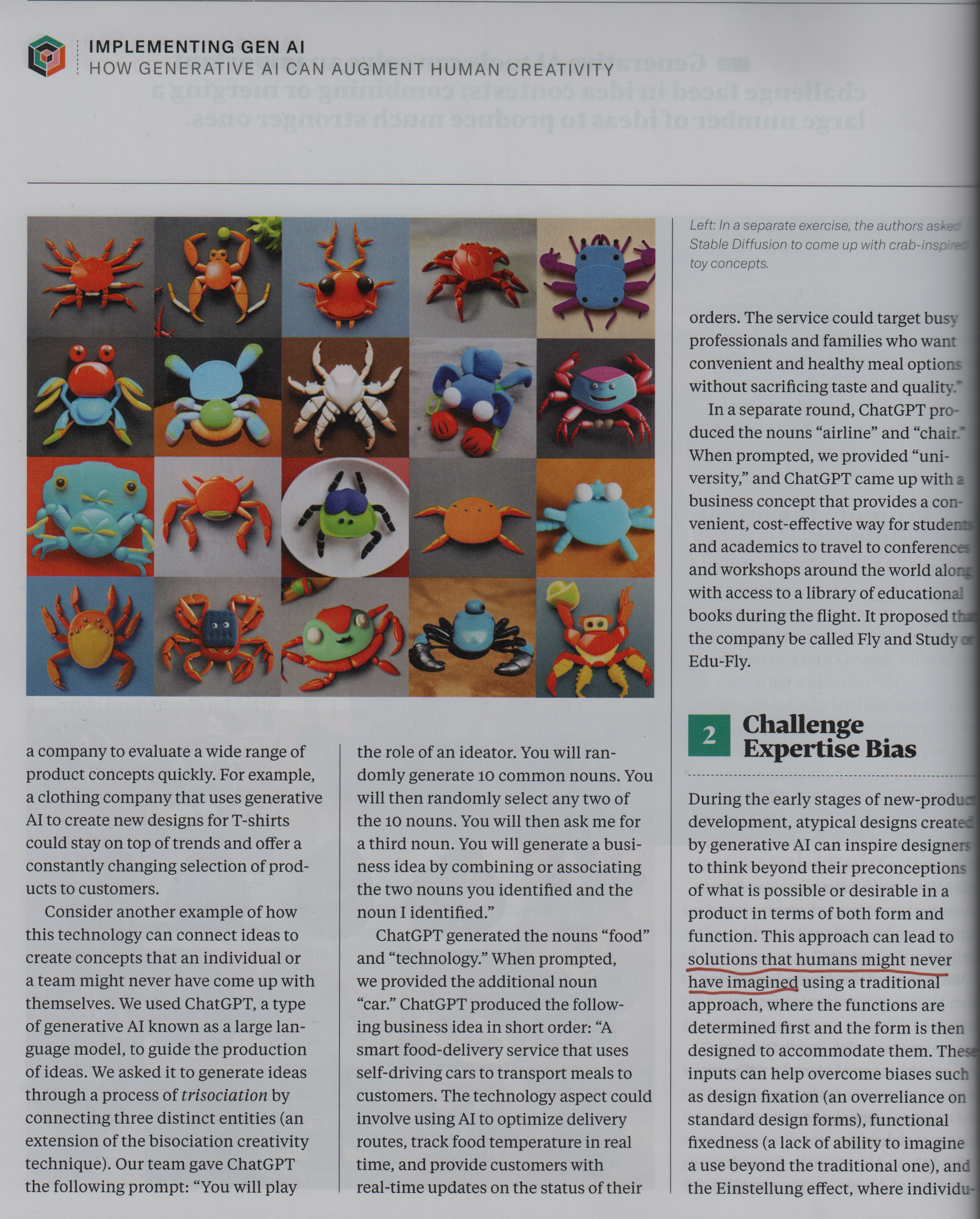 Según dice la revista, el que la GenAI nos descargue de tareas mundanas nos hará más creativos. Pero esto no es verdad. No nos hará más creativo. La GenAI nos va a dirigir los caminos. O a abrir nuevos que serían impensables. Y esto va en relación a lo que he aportado en el Parlamento de Andalucía (ver noticiasdealmeria.com) Y es que si la IA lo dice la prole lo hace.