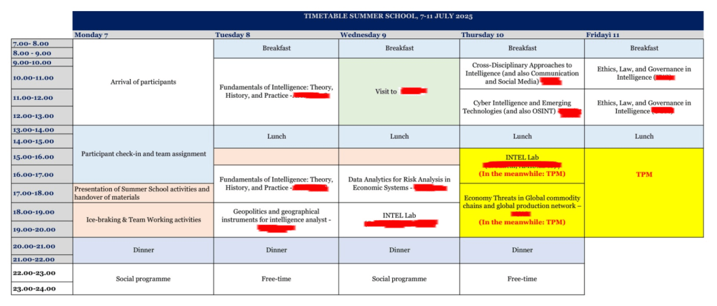En un esfuerzo conjunto, bajo el amparo de agencias de inteligencia financiadas por Europa y la Universidad de Almería, estamos creando un itinerario formativo para capacitar al personal técnico en el rol de Analistas de Información en toda Europa. Nuestro objetivo es reforzar la defensa de Europa. Tras asistir a un curso intensivo sobre geopolítica y amenazas, los estudiantes seleccionados serán formados por nosotros en Italia, siguiendo esta planificación. Los datos sensibles han sido ocultados por razones de seguridad.